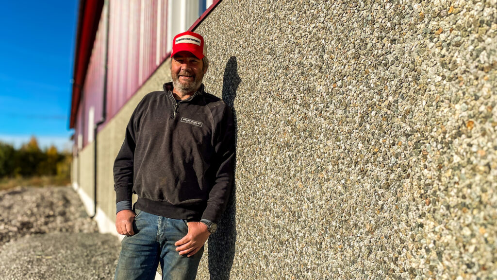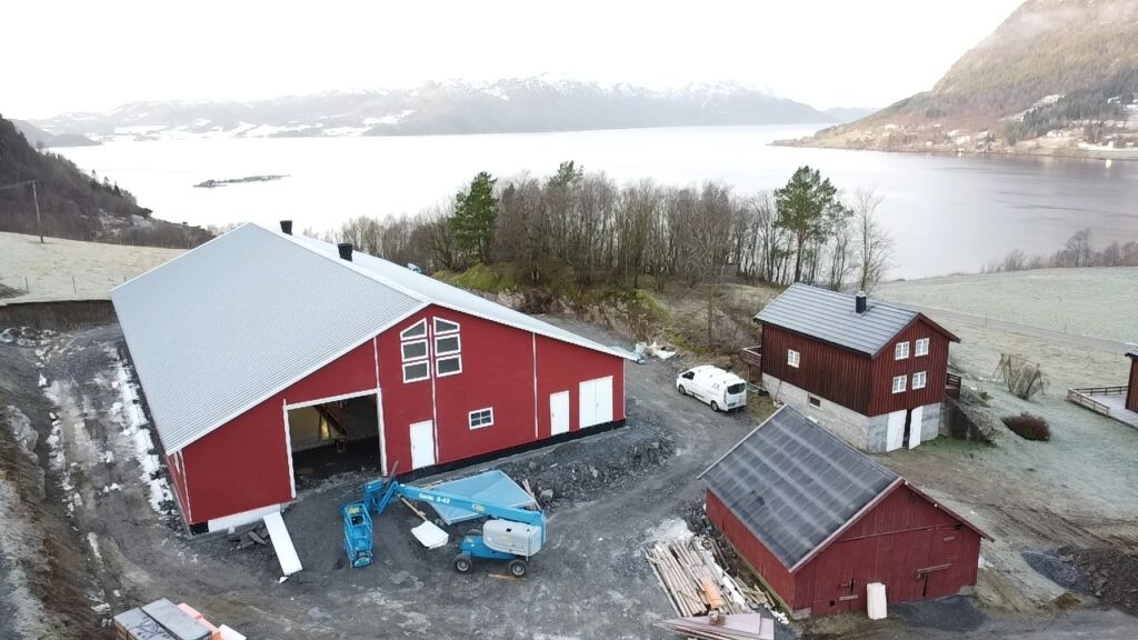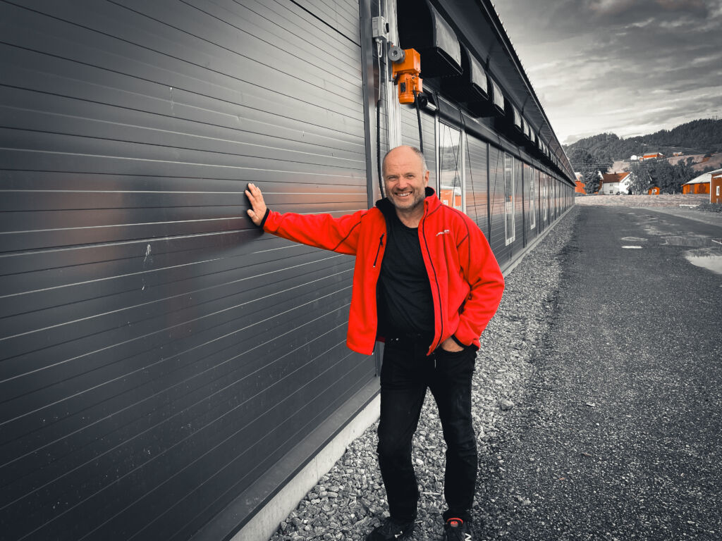 Karl Frode Slettedal forteller om sitt flotte nybygg. Det er oppført med stålkonstruksjoner og massivtre, og har naturlig ventilasjon. Dette