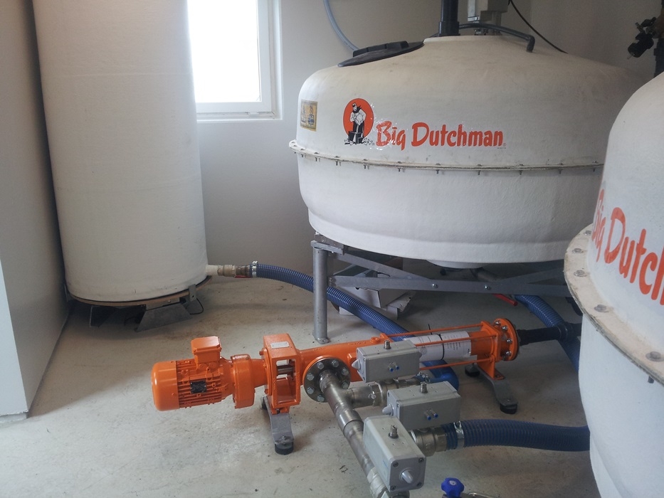 Vi har det velkjente systemet for våtfôring fra Big Dutchman. Dette er et robust og velfungerende anlegg med praktiske løsninger.