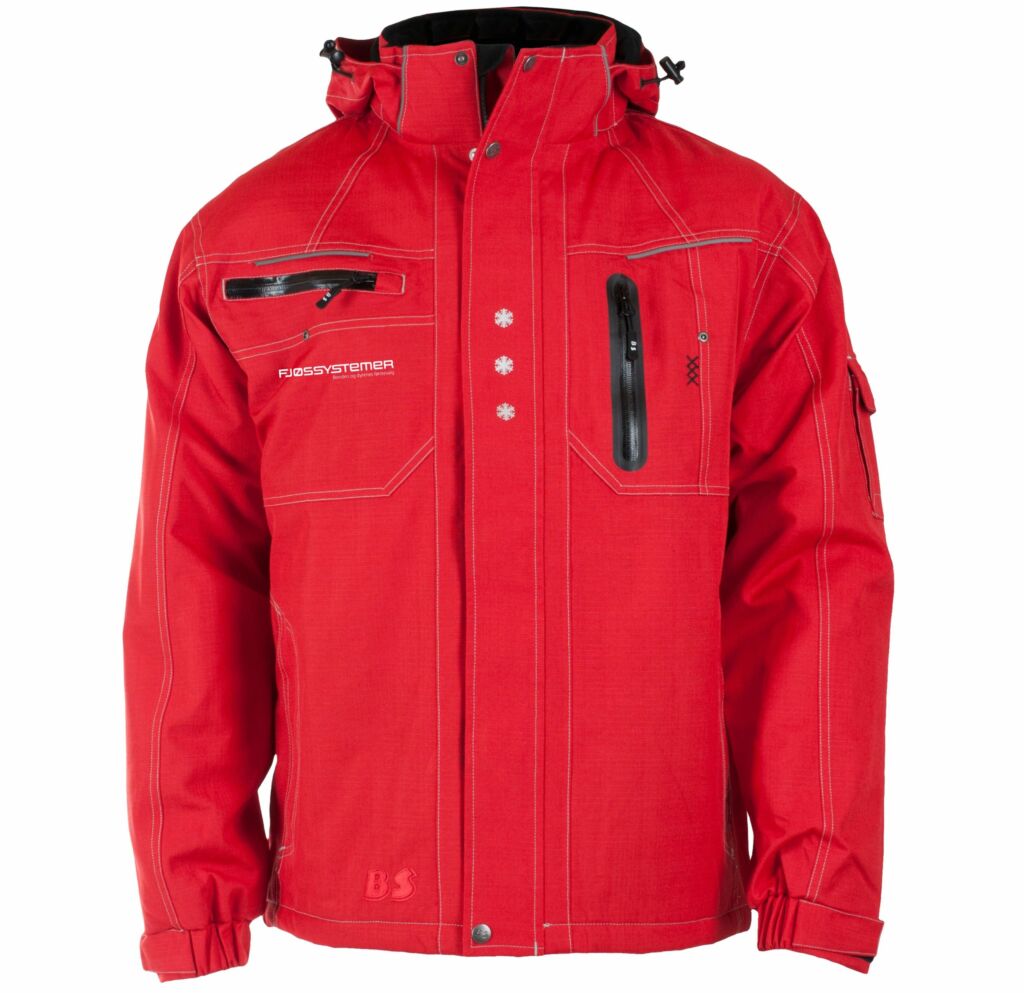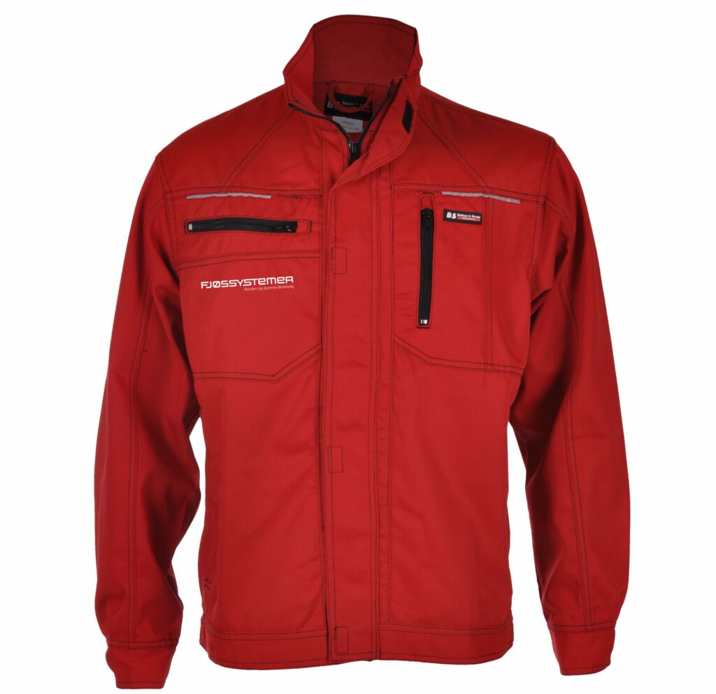Håndverksjakke med to brystlommer og to stikklommer med glidelås. Glidelås med klaff i front. Farge: Rød Svart Kvalitet: 65% polyester