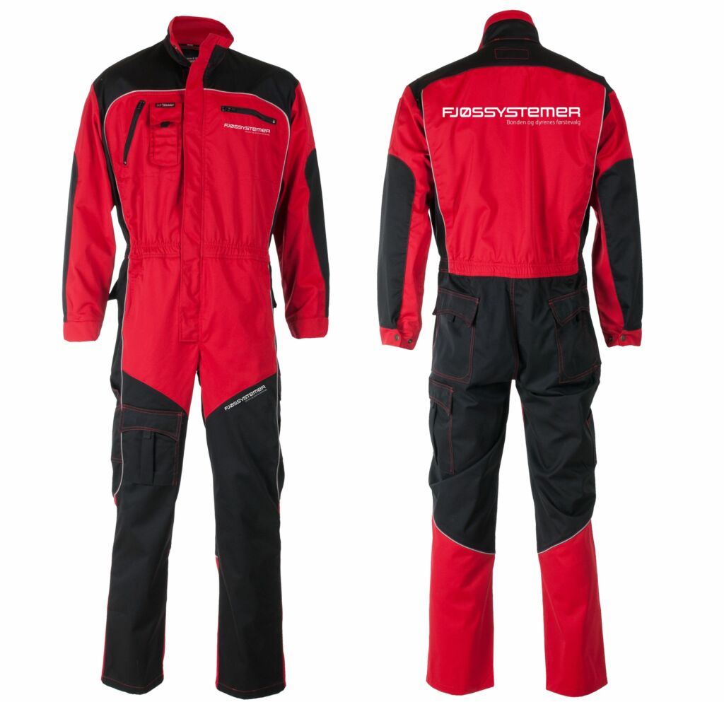 Kjeledress med strikk i liv, glidelås i front med klaff, gjennomgrep, stikklommer, tommestokklomme, brystlommer, to lårlommer og mobillomme. Farge: Rød
