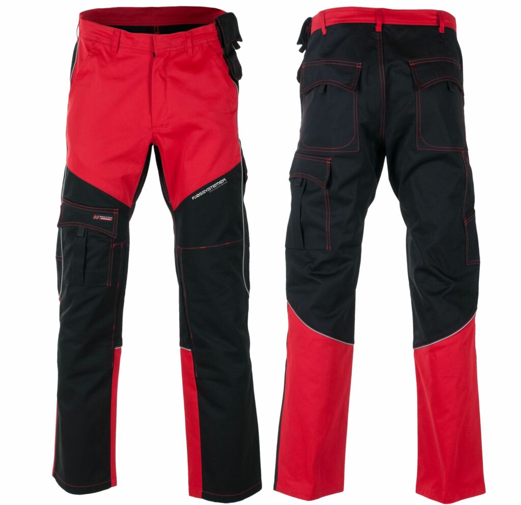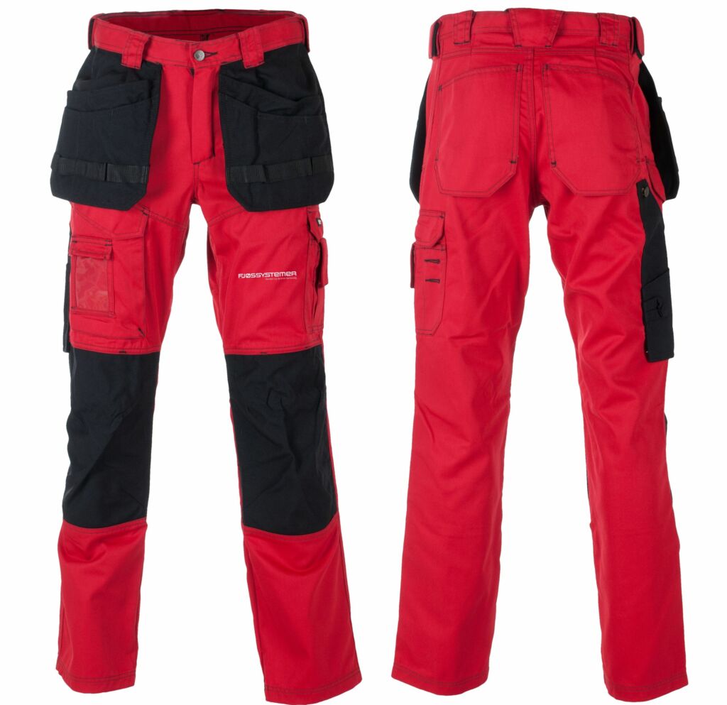 Buksen har lårlommer, stikklommer, baklommer med klaff, mobillomme og tommestokklomme. Innvendige knelommer. Refleks i bise. Farge: Rød Svart Kvalitet: 65%