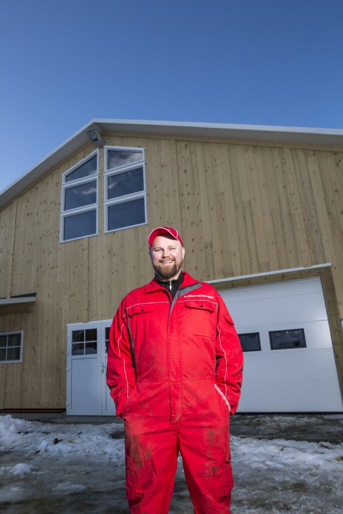 Karl Frode Slettedal forteller om sitt flotte nybygg. Det er oppført med stålkonstruksjoner og massivtre, og har naturlig ventilasjon. Dette