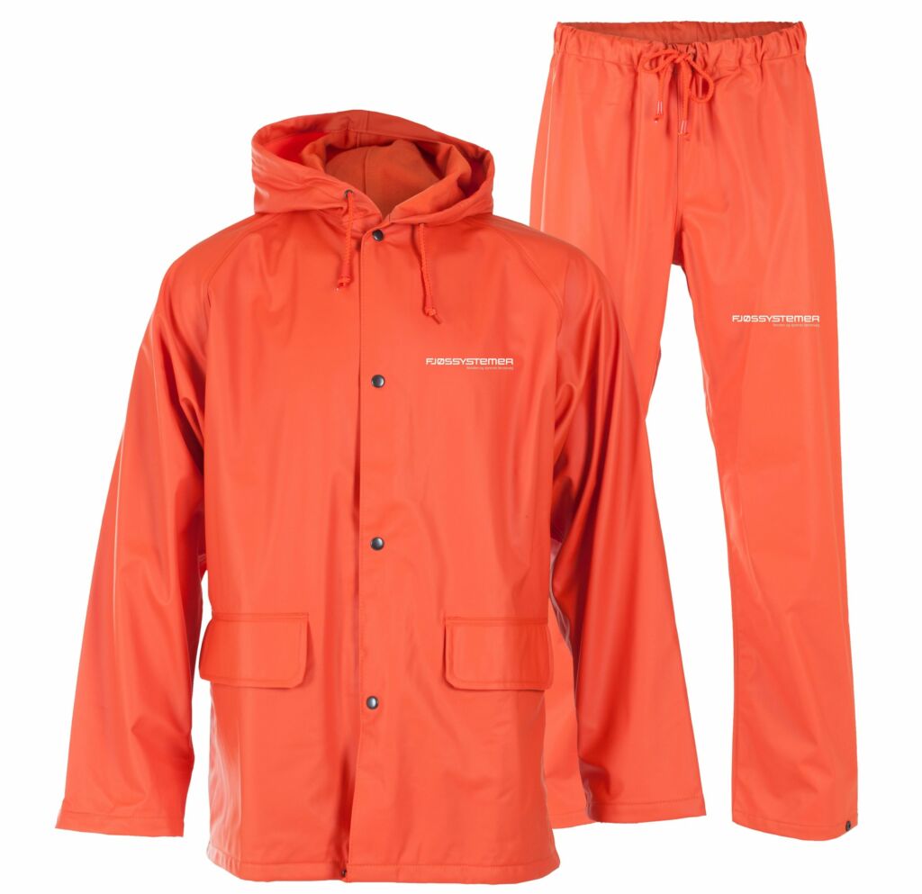 Et meget godt regntøysett i kraftig PU med flosset bakside. Jakke med hette og sidelommer, klaff på rygg for luftsirkulasjon.