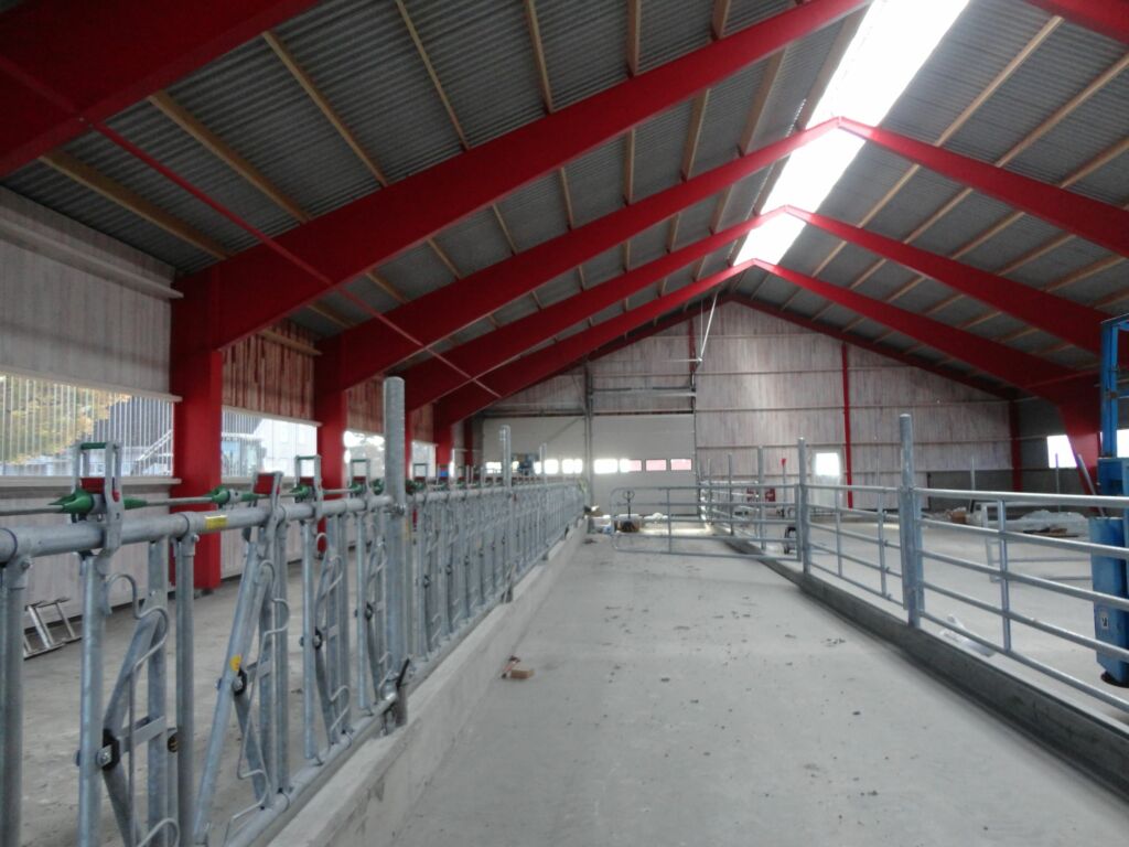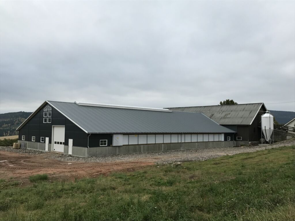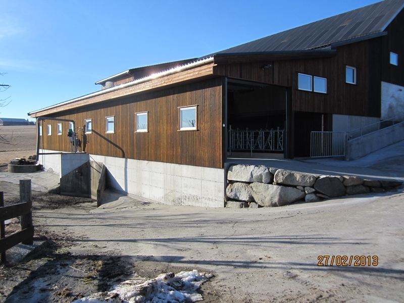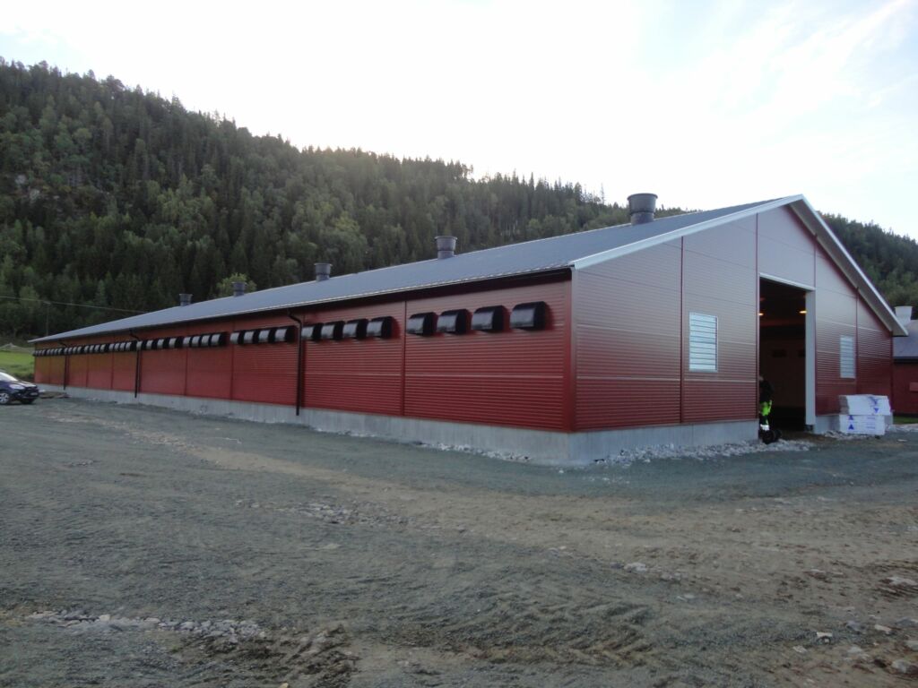 Nytt Melkekufjøs på 944 m2 med bærekonstruksjon i stål, betongbrystning og sandwich på vegg og tak. Naturlig ventilasjon.