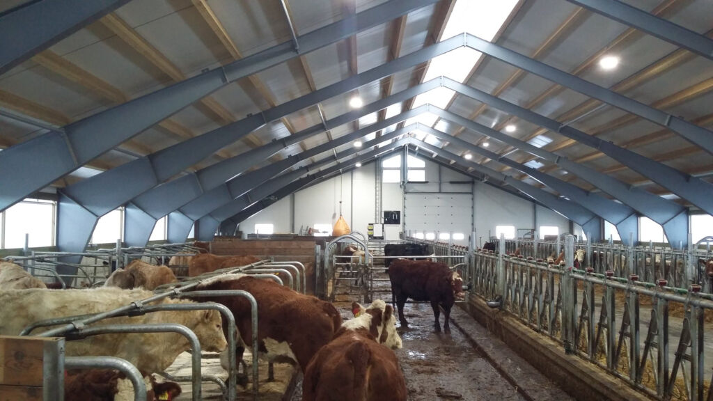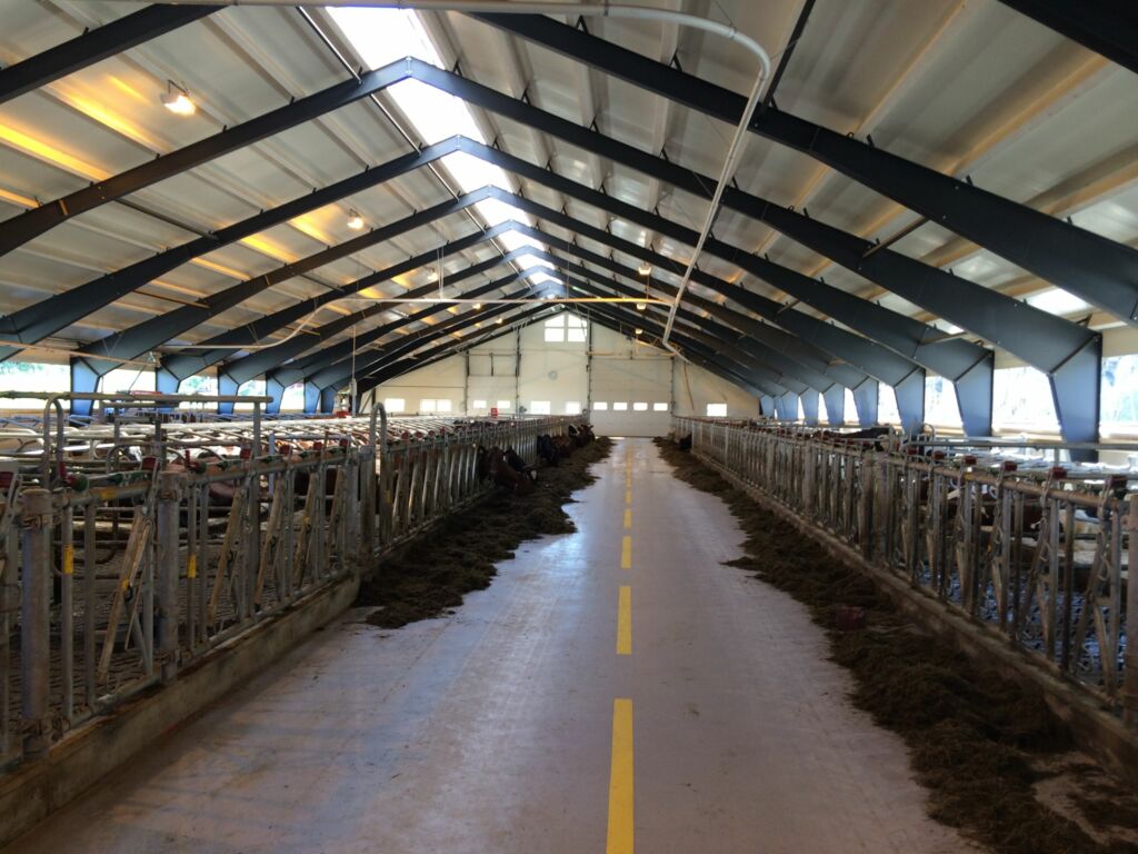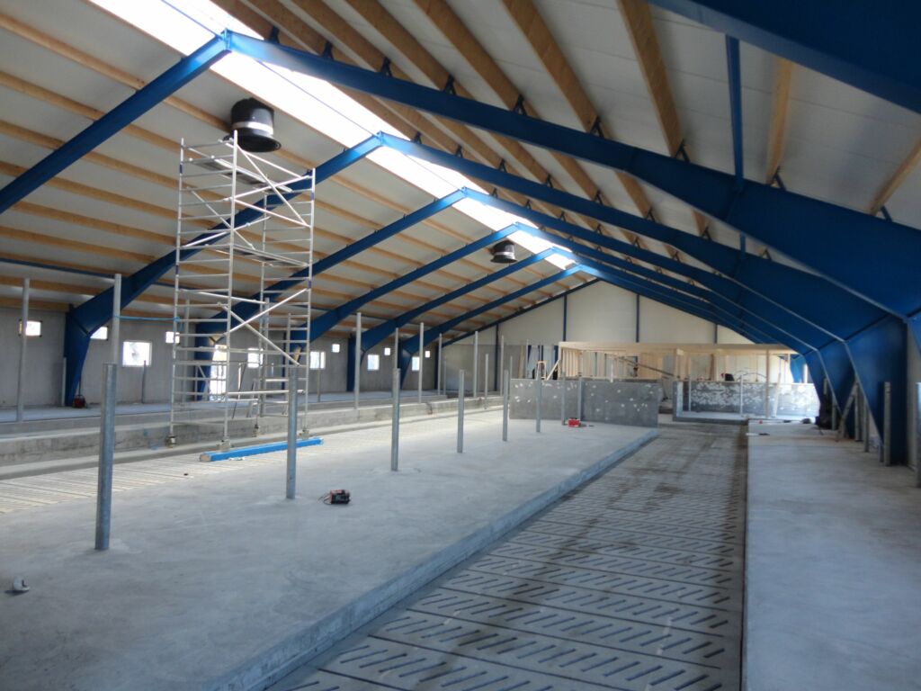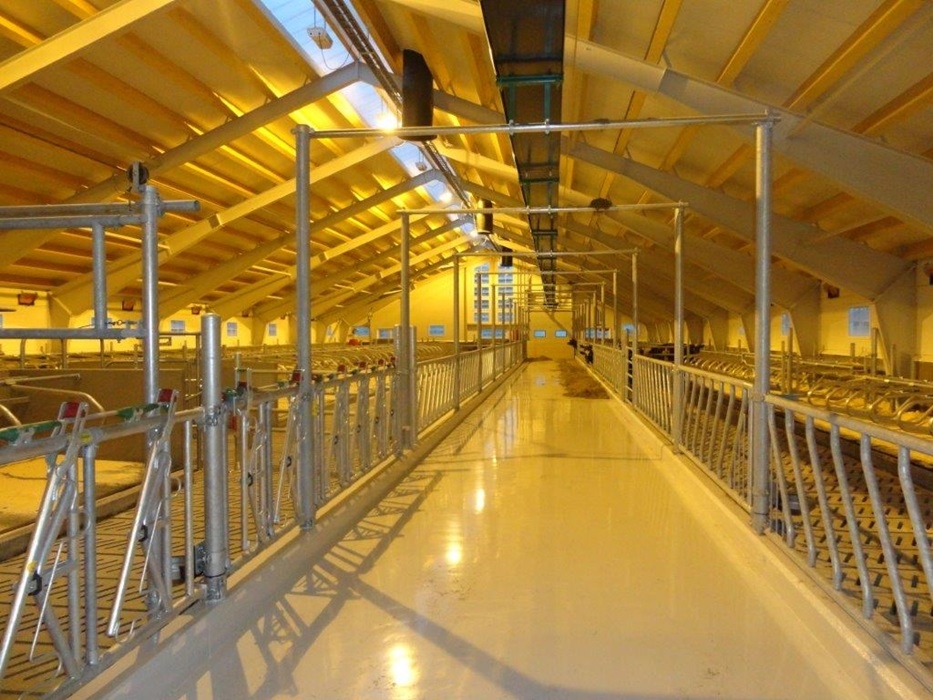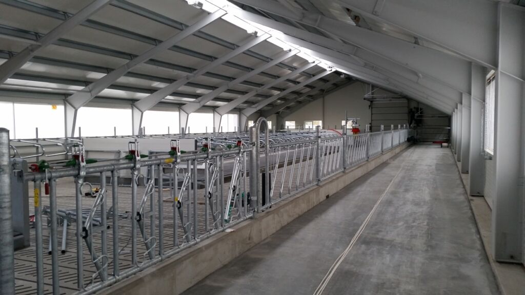 Nytt Melkekufjøs på 944 m2 med bærekonstruksjon i stål, betongbrystning og sandwich på vegg og tak. Naturlig ventilasjon.