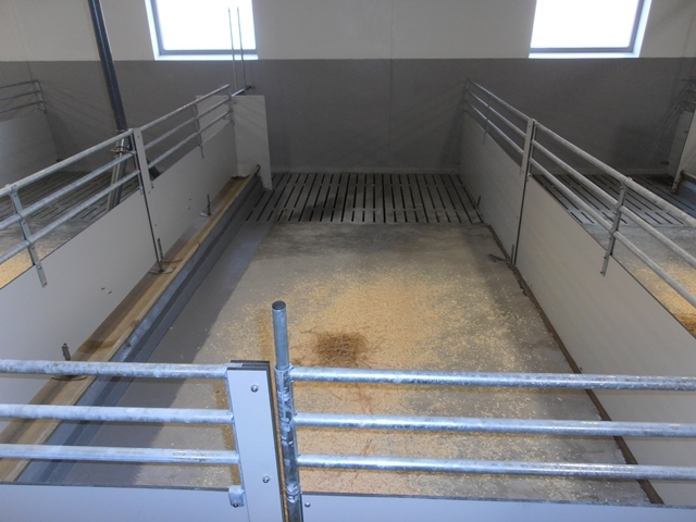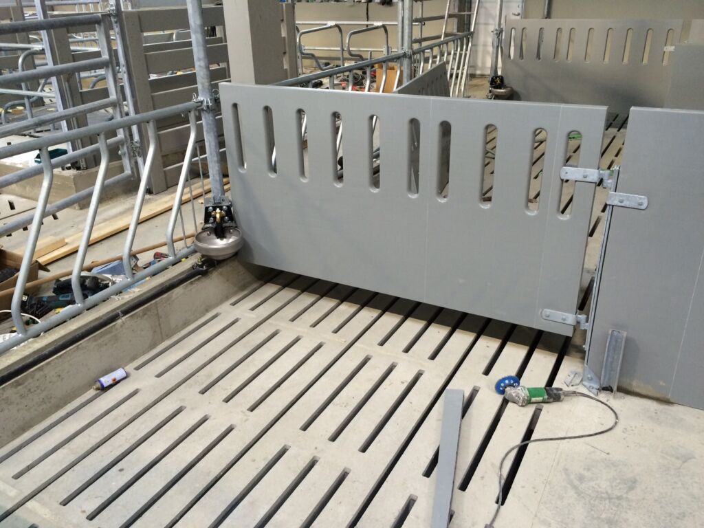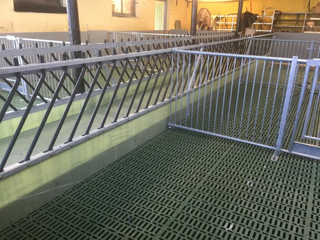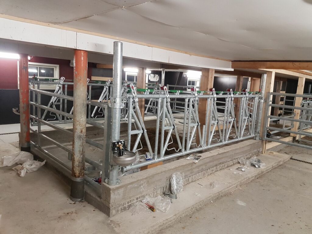 Ombygd kufjøs i Gausdal til Paul Ingar Venås. Mik stepper plastrister m/galvanisert stålbæring Lammesikker front Bingeskiller med stående spiler i