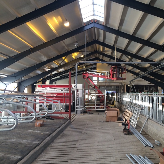 Nytt mjølkefjos for 20 melkekyr hos Olav Opheim, Voss. Vi har levert brukt Lely A4, DairyPower, Jourdain fangfrontar, Easyfix båsskille