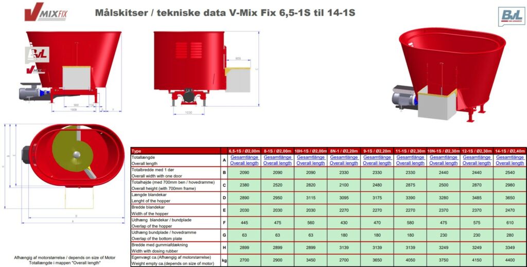Fjøssystemers BvL V-Mix fullfôrmiksere har vertikal miksesnegle. Vertikale snegler er effektivt på rundballer, og takler godt frosne baller. Vi leverer både en-snegla, to-snegla og tre-snegla miksere. Motorstørrelsen på fullfôrmikserene tilpasses mengden fôr som skal mikses. Se mål og dimensjoner lenger ned på siden.